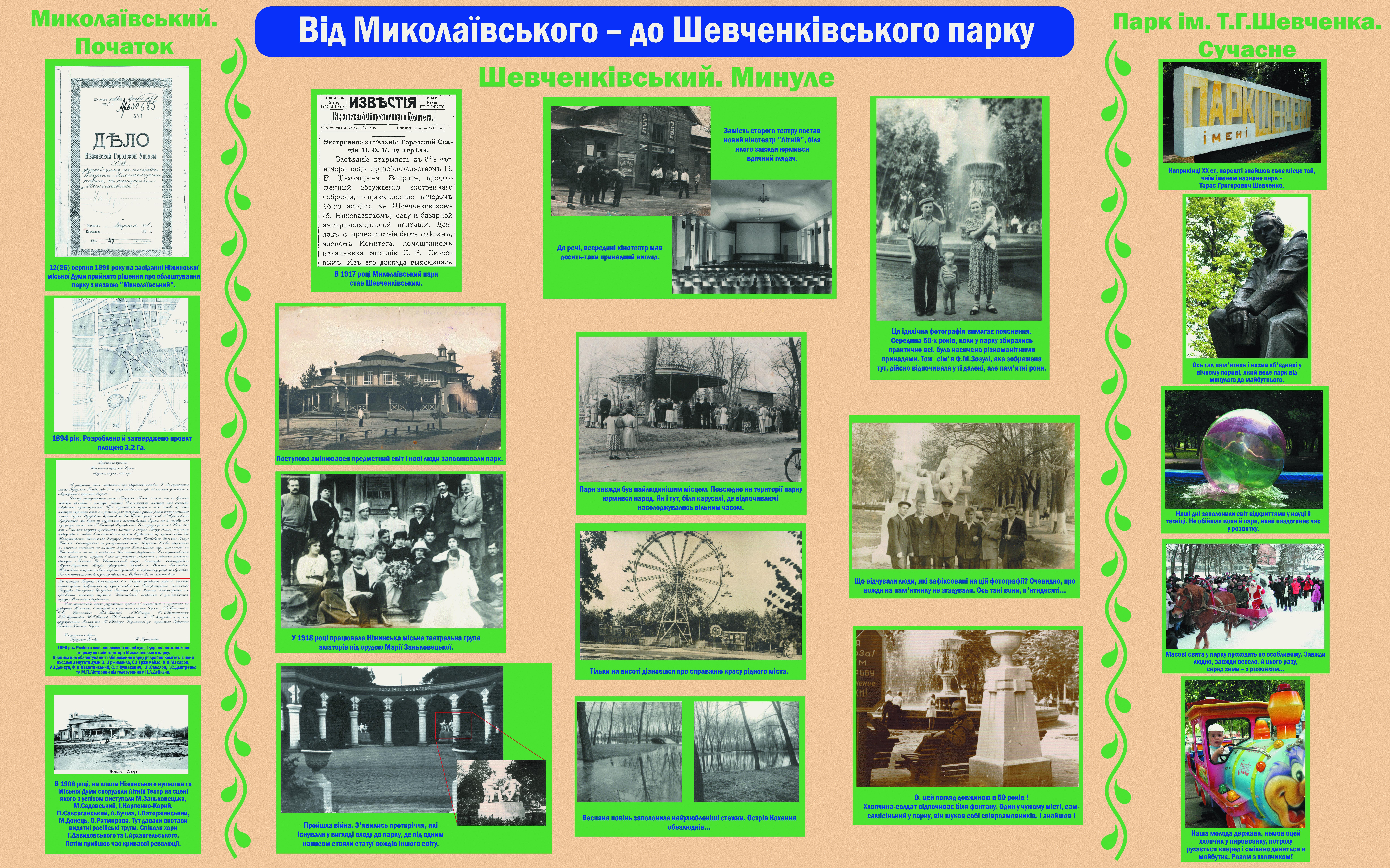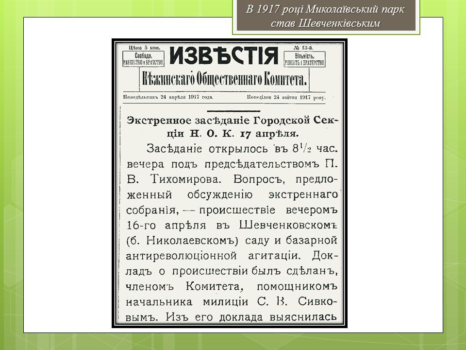 /p Закладений у 1894р. як Миколаївський депутатми Міської Думи.У 1906р. на території парку було зведено літній театр (не зберігся), на підмостках якого виступали М. Заньковецька, М. Садовський, П.Саксагнський та ін. p/