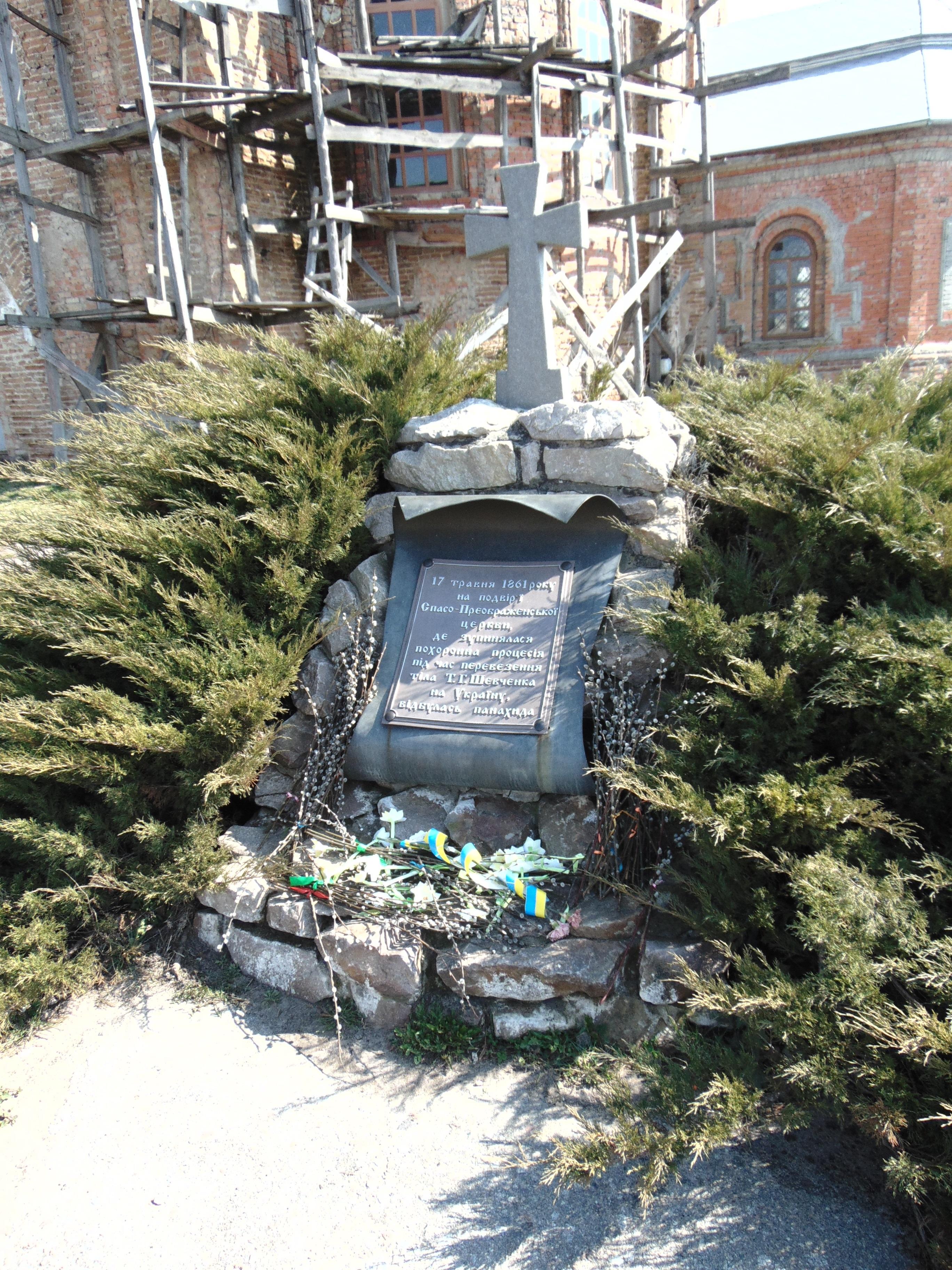 На вулиці Московській 1991 року встановлено пам’ятний знак «Останній шлях Кобзаря» біля Спасо-Преображенської церкви. Церква є пам’яткою архітектури національного значення та діючою у складі УПЦ КП. Був відслужений жалобний молебень.