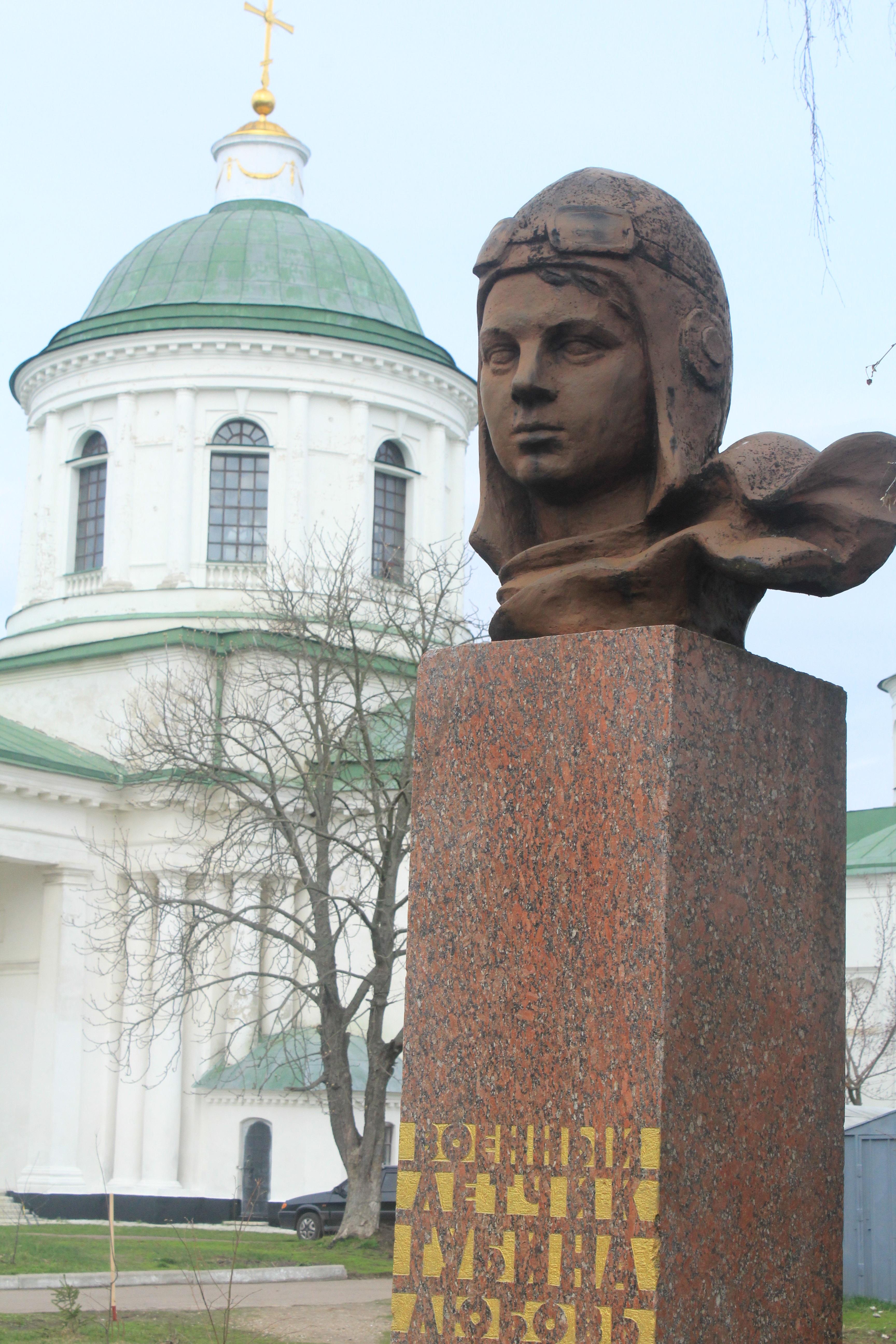 В лютому 1974 р. ніжинська громадськість вирішила встановити пам’ятник відважній землячці. Бюст був відлитий на громадських засадах головним металургом заводу „Динамо” Діною Тимофіївною Карасовою із заощадженої бронзи. Архітектор – професор Микола Адамович Ковальчук. Пам’ятник льотчиці встановлений 13 вересня 1975 року у сквері по вулиці Гоголя. Пам’ятник являє собою скульптурний портрет Губіної, виконаний з бронзи і занотований в темно-коричневий колір. На шиї розвивається шарф. Постамент має форму чотирикутника, виготовлений з полірованого коричневого з темно - сірими прожилками граніту. На ньому напис: «Военный летчик Губина Любовь Михайловна погибла смертью храбрых, 1916-1943».
