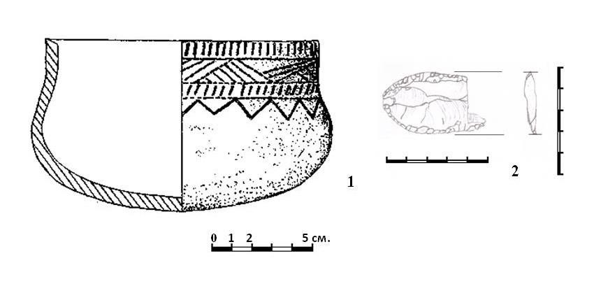 The second horizon quite accurately dates back to the period of finding of an unbroken pot that belongs to the Middle Dnieper Culture and of the fragment of flint knife (the 2nd half of the 3rd millenium B.C.).